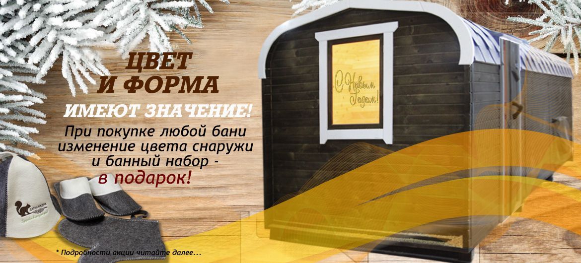 В 2022 году любую выбранную вами баню мы покрасим в понравившийся цвет бесплатно, чтобы порадовать и удивить не только символ года, но и своих домочадцев. А банный набор сделает процедуры парения приятными, комфортными и запоминающимися. Сделайте незабываемый подарок себе и своим близким (по предзаказу*), чтобы уже весной насладиться приятным парением в бане с кедровым ароматом!