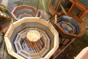 Банный чан с приварной печью печкой изготовлен из пищевой стали. Представляет собой большую ёмкость в виде чаши, при нагревании которой можно париться на свежем воздухе. Банный чан установлен на металлическую подставку и оснащен приварной печью с водяной рубашкой. Благодаря циркулирующей внутри печи воде чан быстрее нагревается и медленнее остывает. В комплект такой модели входит трёхметровый разборный дымоход. Чан оборудован кедровым бортом, скамейками, подспинниками, трапом для ног и приставной лестницей.