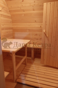 Это более просторная модель за счет увеличенной высоты потолков и ровного пола. В такой модели раздевалка совмещена с моечной. Тут установлен душевой поддон, вешалка, полочка и лавочка из кедра. В парильном отделении по обе стороны расположены двухуровневые открытые полки, печь находится между ними у дальней стены. Время растопки такой бани не превышает 30 минут. По вашему желанию баню-бочку можно укомплектовать козырьком, верандой и печью с внешней загрузкой, благодаря которой весь мусор во время топки остается на улице. Баня-бочка буханка не требует полноценный фундамент, поэтому при необходимости ее можно перенести в другое место.