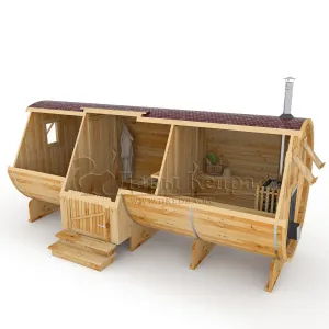 Боковой вход у такой модели находится в начале или в середине конструкции. В увеличенные модели можно повесить полочки и вешалки из кедра. Время растопки такой бани не превышает 30 минут. По вашему желанию баню-бочку можно дополнить печью с внешней загрузкой, благодаря которой весь мусор после топки останется на улице. Круглая баня-бочка не требует полноценный фундамент, поэтому при необходимости ее можно перенести в другое место.