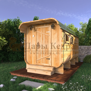 Это прямоугольное изделие с закругленными углами. За счет такой конструкции во время топки воздух циркулирует по кругу, поэтому баня-бочка нагревается не более 30 минут. Козырек не только украшает баню, но и защищает оставленную обувь от дождя. Лавочки из кедра находятся по всей длине бани-бочки с обеих сторон. Печь расположена в парилке около дальней стены. В зависимости от выбранного размера баня-бочка квадро с козырьком имеет следующую комплектацию: