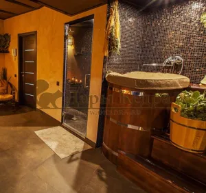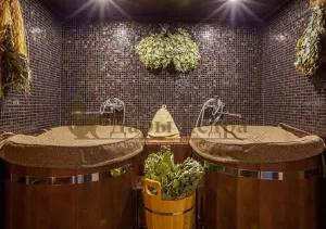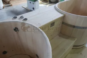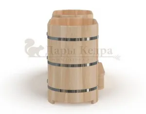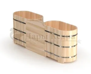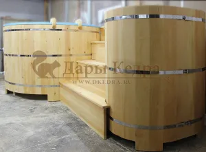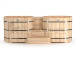 Двойная купель из кедра чаще всего используется в крупных банных комплексах и оздоровительных центрах. Она представляет собой две овальные чаши для воды, в которых люди отдыхают после парения. Между купелями установлен широкий подиум из кедра, по которому могут спускаться и подниматься сразу несколько людей. Для комфортного отдыха купель оснащена лавочками и двумя дополнительными лестницами. Обручи из нержавеющей стали декорируют изделие и равномерно распределяют нагрузку воды во время пользования. При правильном уходе купель для бани не рассыхается и не подвергается гниению.
